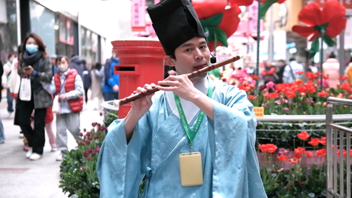 为了脱颖而出,小董开始身穿汉服吹笛箫——还会应着四季流转而更换好几套。以静安寺为“背景”,身穿汉服吹笛箫的小董成为观众相机框里的“前景”,甚至“特写”,声画对“味”。